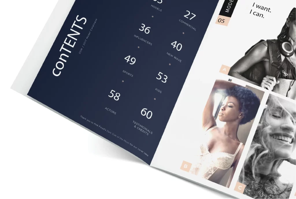 This model catalogue for 3D Models was designed to feel sharp, editorial and easy to navigate. With a large roster of talent ranging from commercial to fashion to influencers, the challenge was to create a flexible layout system that felt dynamic but stayed organised. We introduced a strong typographic grid, bold colour accents and a modular structure that lets the agency showcase faces and personalities with clarity and impact. From cover to credits, the design balances function with flair, giving casting agents and clients a beautiful tool they can actually use. “Less like a directory, more like a fashion publication with purpose.” The result is a sleek, high-end catalogue that elevates the agency and puts the models at the centre.