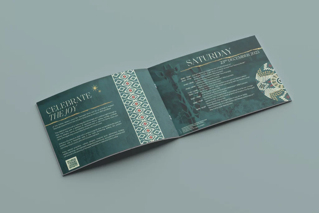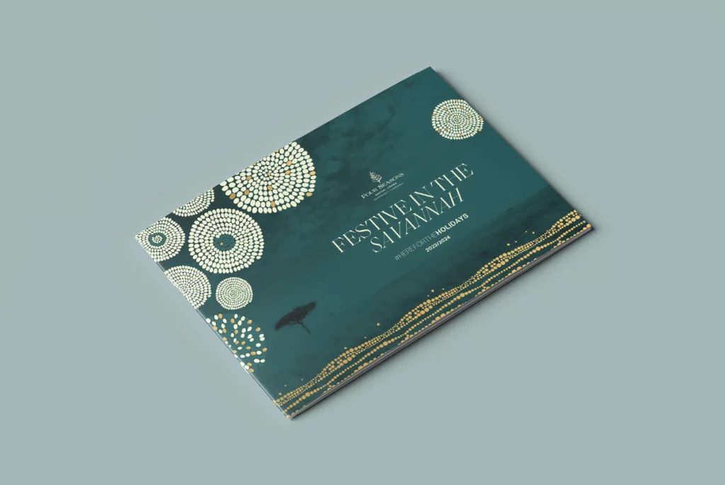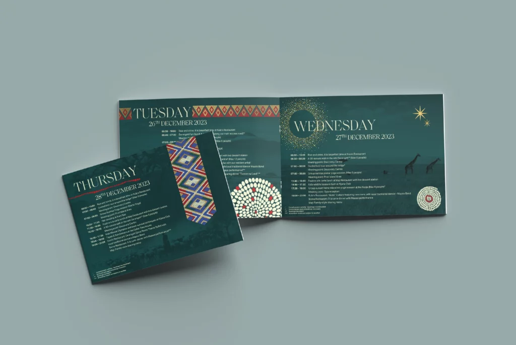 This festive season brochure for Four Seasons Serengeti was designed to immerse guests in the unique spirit of the African savannah. The visual identity takes its cues from Maasai beadwork, traditional weaving patterns and the natural forms of the landscape, translated into modern graphics that feel both celebratory and culturally grounded. The dark teal backdrop provides an elegant canvas for detailed motifs and warm, luminous gold accents, reminiscent of starry skies and festive firelight.