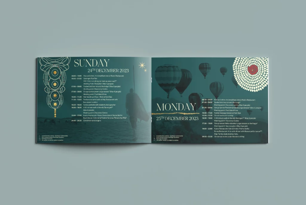The layout balances a practical daily schedule with rich visual storytelling, using atmospheric photography and custom illustrations to guide the reader through each experience. From sunrise safaris to evening family events, the content is organised in a clear, engaging flow that makes planning effortless for guests while evoking a sense of adventure and luxury. Every design element, from typography to ornamentation, was curated to reflect both the exclusivity of the Four Seasons brand and the authenticity of the Serengeti setting.