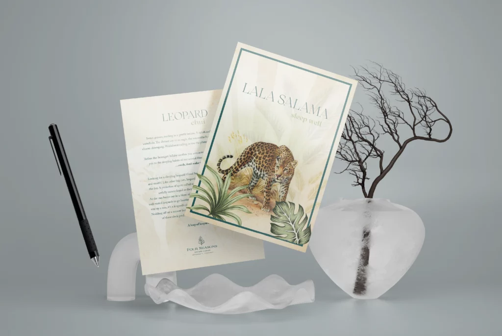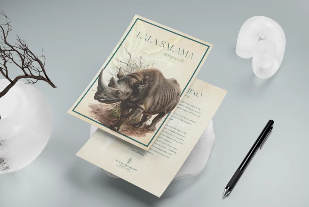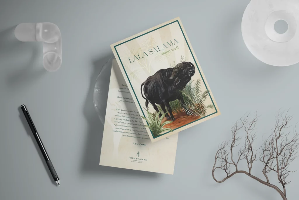 A set of illustrated turn-down cards for Four Seasons Serengeti, designed to evoke a sense of comfort and wonder through elegant storytelling and hand-drawn artwork. Each card features a safari animal paired with its Swahili name and a short, poetic message about its character or symbolism, inviting guests into a peaceful night of rest. The design approach balances naturalist illustration and vintage-inspired texture with clean serif typography to convey both warmth and sophistication. Thoughtful copy and calming tones make these cards a unique part of the in-room experience, reinforcing the resort’s deep connection to its African surroundings.