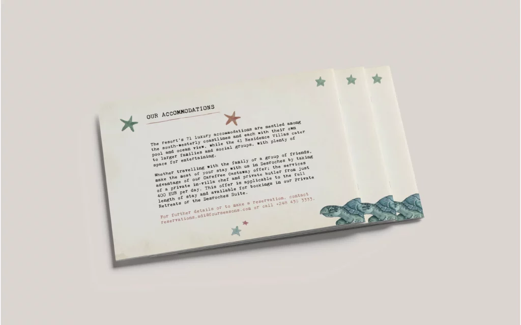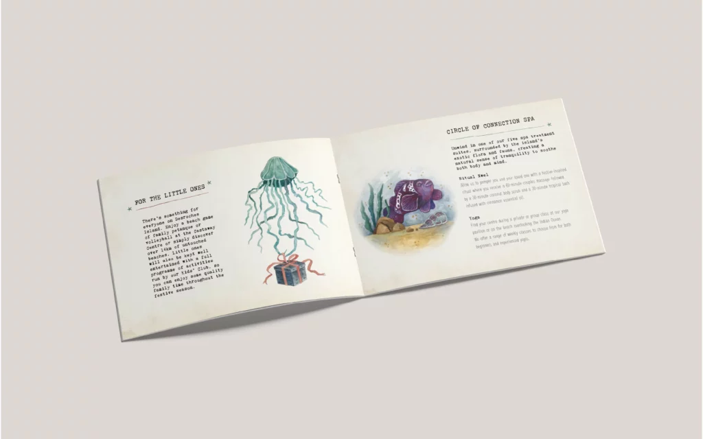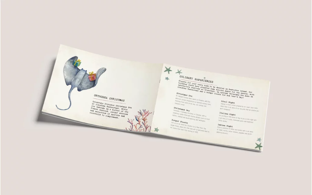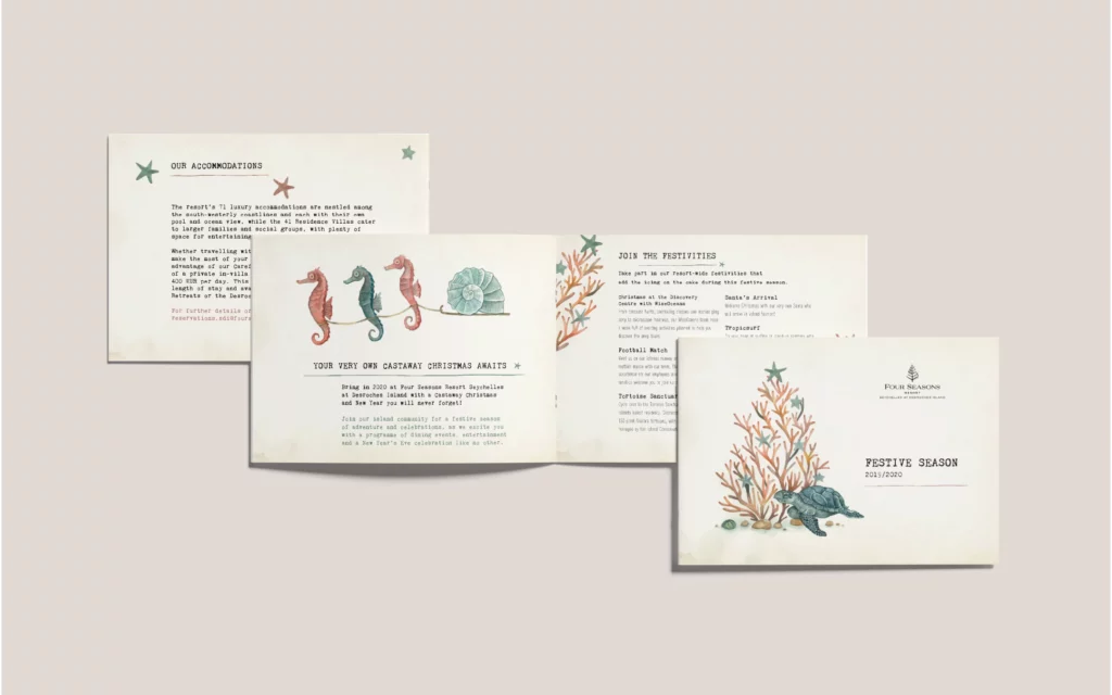Designed for Four Seasons Seychelles at Desroches Island, this festive season brochure blends bespoke illustration with the charm of handwritten storytelling. The artwork features coral reefs, seahorses, and turtles, drawing directly from the island’s natural surroundings to evoke a sense of place and seasonal warmth. The visual style is whimsical yet refined, giving the piece a playful elegance suited to families and luxury travellers alike. Layouts were kept simple and airy, allowing the delicate illustrations to anchor each page while making the content easy to navigate. The result is a brochure that invites guests into a magical, barefoot holiday experience with clarity and charm.