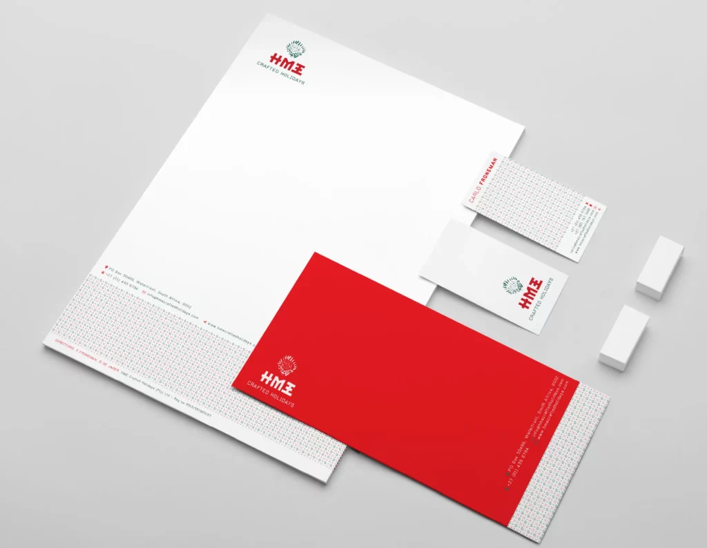 HME is a boutique travel company curating high-end South African experiences specifically for the Chinese market. The task was to design a brand identity that bridges cultures—evoking trust, refinement, and a sense of tailored exploration. Sorted Design International developed a clean, confident identity system that fuses Eastern symbolism with contemporary minimalism. At its heart is a geometric logo that combines a stylised protea with structured Chinese-inspired characters, expressing both local authenticity and cultural resonance. The colour palette of vivid red, soft grey and crisp white nods to traditional Chinese elegance while feeling fresh and globally premium. Supporting graphic patterns subtly echo travel stamps and handcrafted textiles—adding texture without overwhelming the design. Business cards, envelopes, and letterheads were crafted with care, balancing clarity with a quiet visual rhythm. “We wanted to create something that didn’t feel ‘touristy’, but bespoke—like an invitation to something rare and considered.” The result is a brand that feels both grounded and aspirational, ready to connect discerning Chinese travellers with the magic of South Africa.