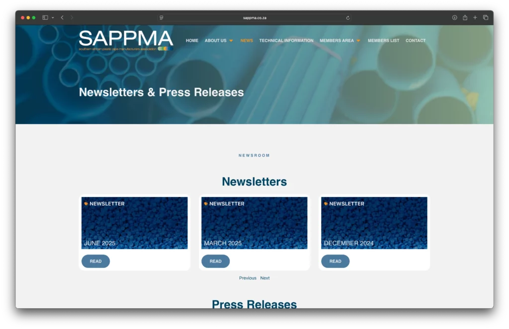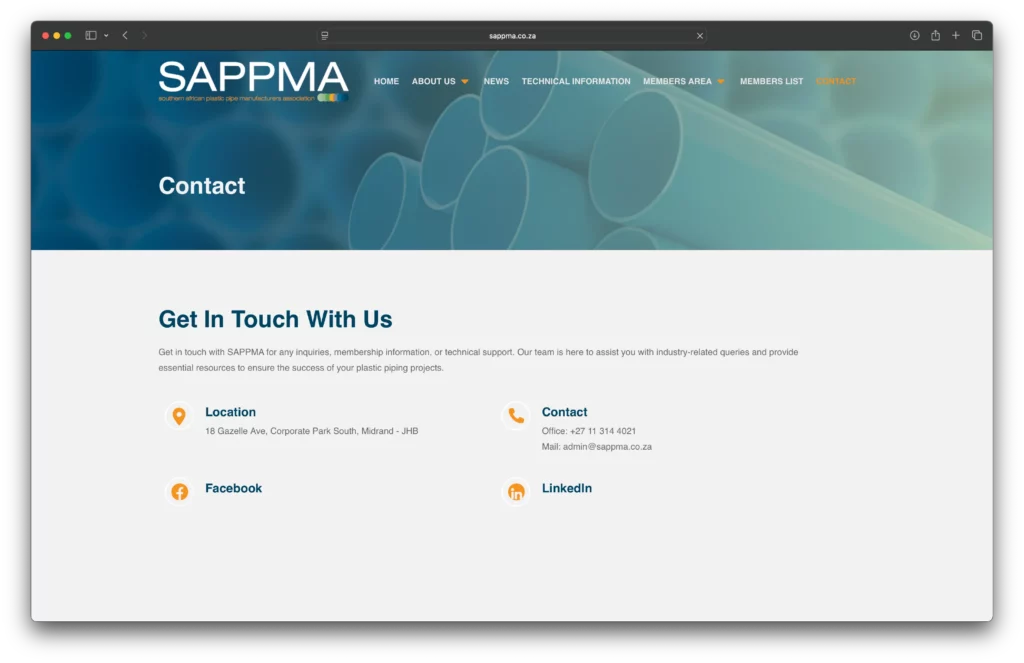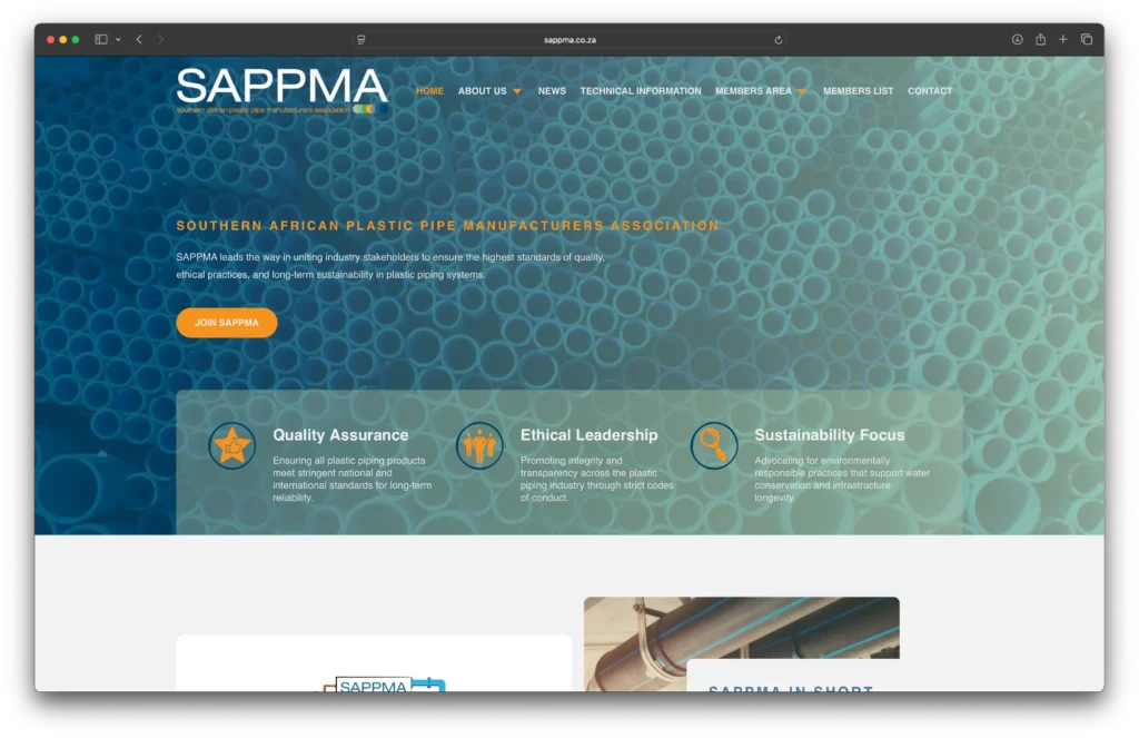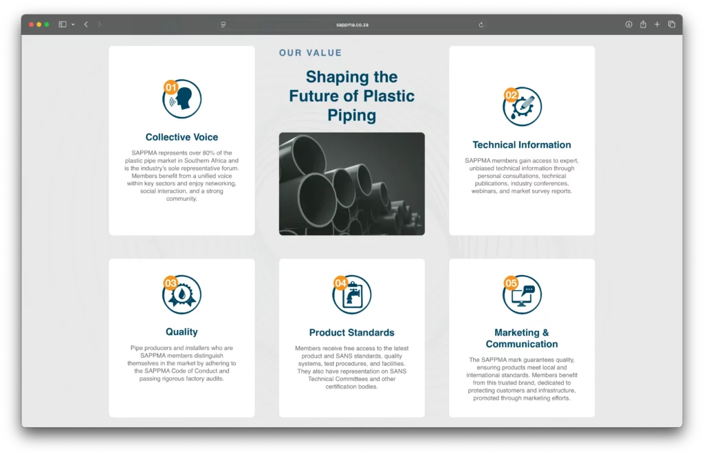 SAPPMA represents the certified, standards-driven backbone of South Africa’s plastic pipe industry. The website needed to reflect this authority while remaining clear, accessible and technically sound.